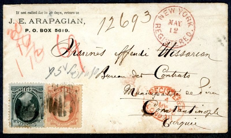 159, 165 On 1875 cover to Armenian in Constantinople, two singles tied by cork cancels, perf tip toning, New York & London registered transits, crayon markings; British Constantinople receiver on back along w/ pencil marks; F-VF (Image)