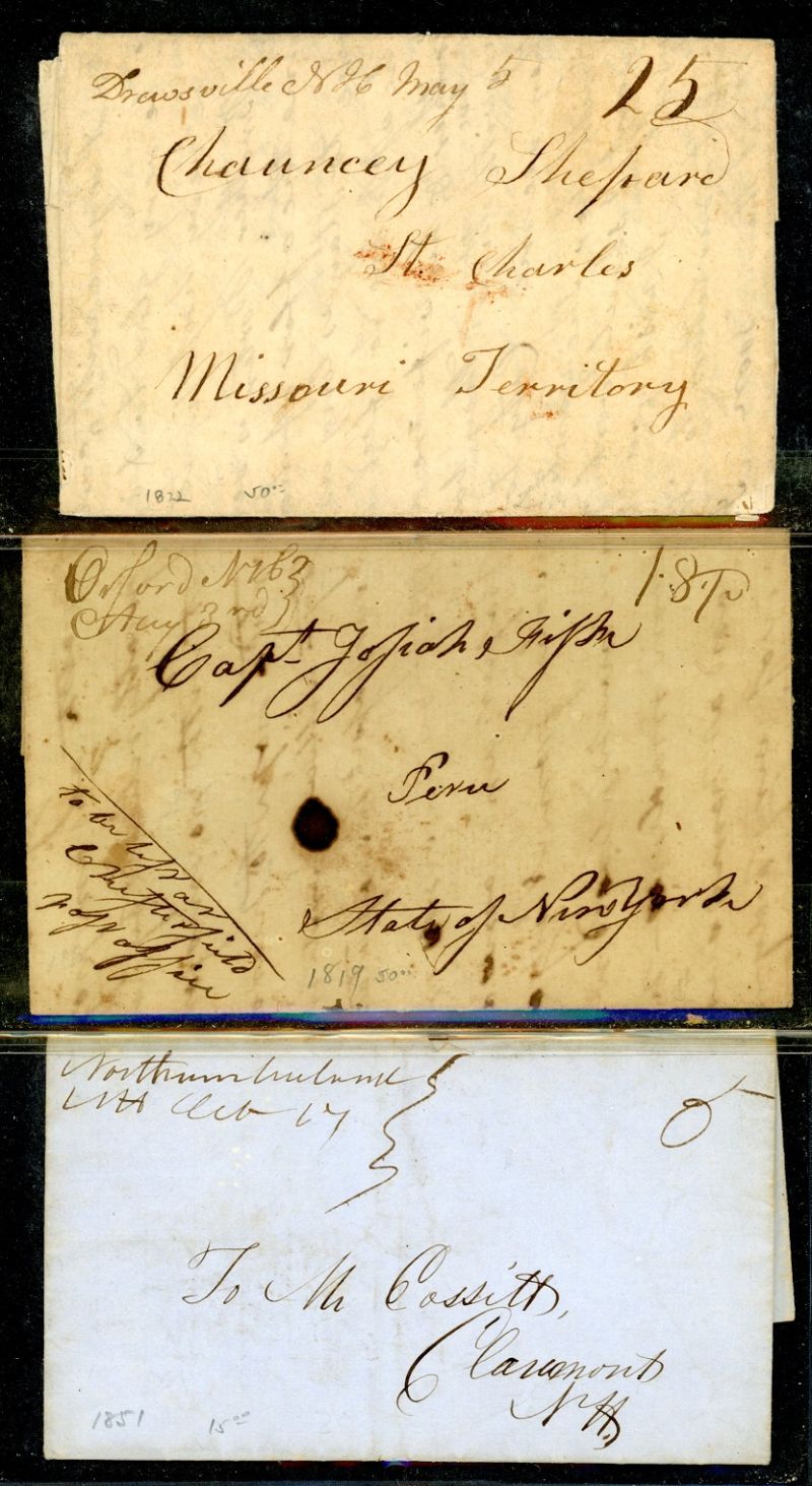 NEW HAMPSHIRE Group of (11) w/ stampless ms town cancels, 1817-53 mostly early FLS, towns incl: Drewsville (1822, unlisted ASCC), Claremont (1817), Lancaster (1824), Northumberland (1851), Oxford (1819), S. Weare (1818), Washington (1823) etc, gen VF for age, some scarce towns, one addr (w/ letter) to Missouri Territory (Image)