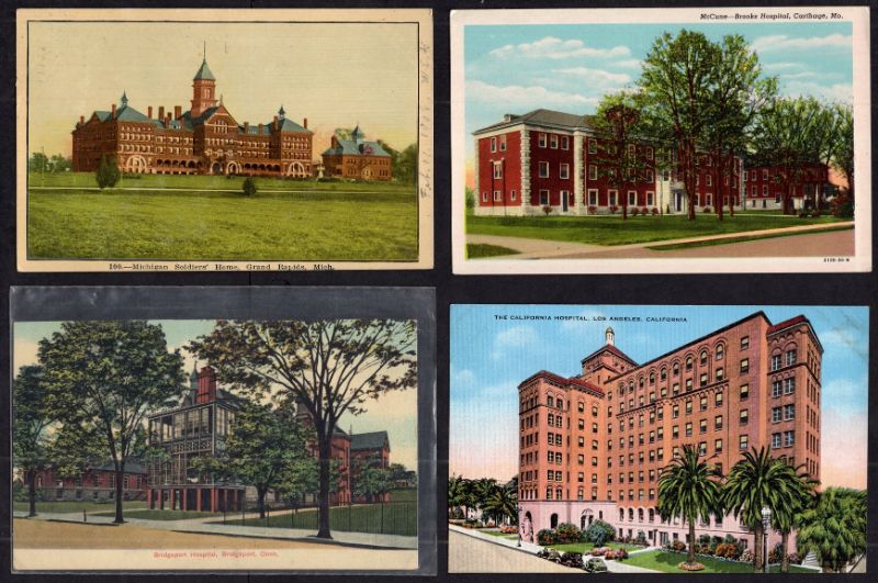 HOSPITALS & SCHOOLS Abt (500) mostly white border to chrome, abt (300) hospitals incl large complexes, older historic buildings, sanatoria, small town sites; abt (200) schools, mostly high schools and colleges from smaller size towns; some vintage & Continental, some mailed, gen F-VF (Image)