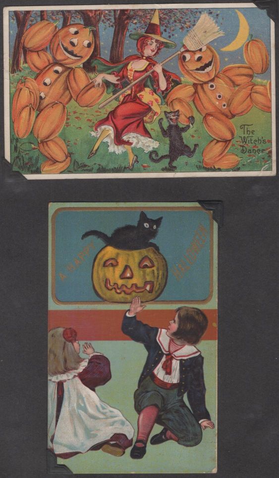 At (240) cards in binder, sorted by topic incl cats, fires, flower covered autos & other transport, George Washington & patriotic, children, Thanksgiving, (5) Halloween, more; many embossed or fancy, some typical minor corner wear, gen F-VF (Image)