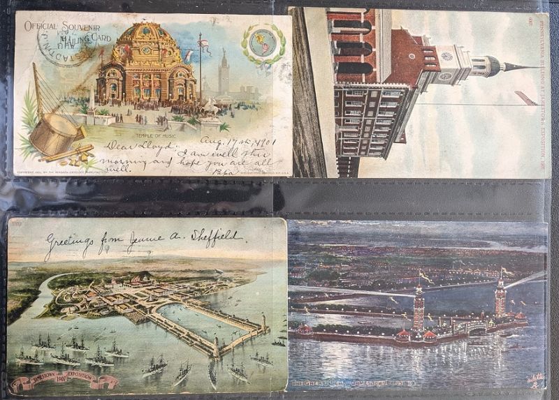 Several (100) in plastic pages in (2) binders, grouped by topic: Presidents, Expos & Fairs and Hotels; Incl portraits, family, homes & monuments (McKinley to Reagan); expos from Buffalo to Montreal, much Jamestown, also Seattle, Brussels, San Francisco and others; hotels incl old downtown high rises to beach resorts; gen F-VF (Image)