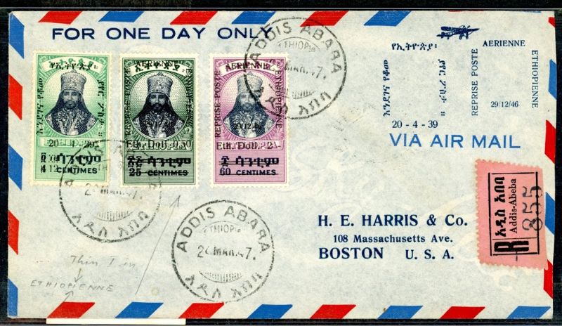 ETHIOPIA Registered airmail cover to US franked w/ complete set C18-20, tied by Addis Ababa 3/24/47 pmks, 3/31 receiver on back, VF (CV for used set $275.) (Image)