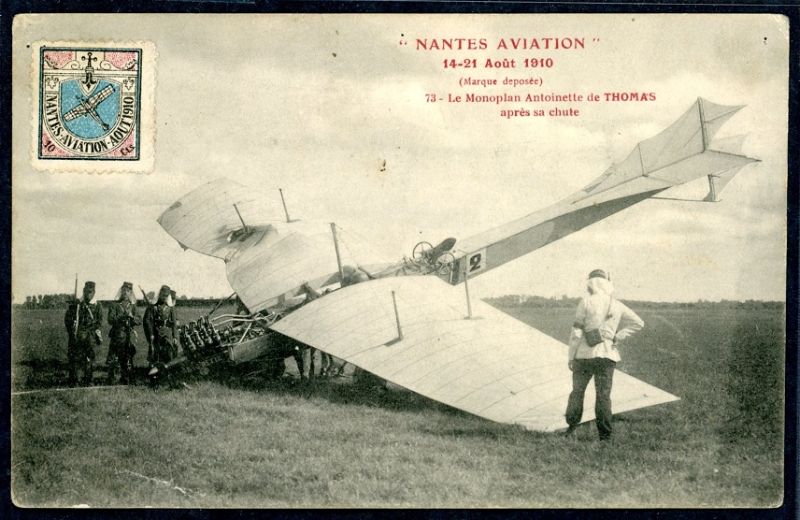 FRANCE 1910 Nantes Aviation Meet picture postcard showing rough landing of “La Monplan Antionette de Thomas”, multi-colored show label affixed but not tied at UL, vertical pair 5c Sower tied w/ special cancels, a scarce & VF early show card (Image)