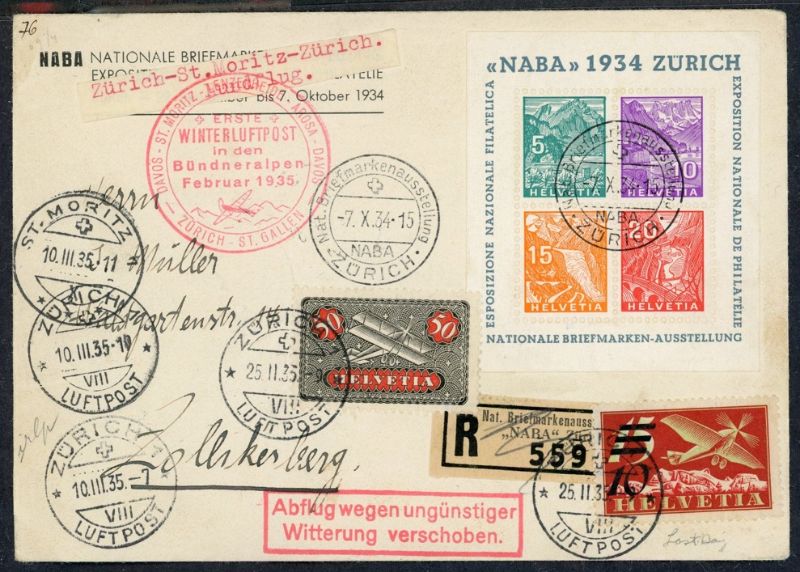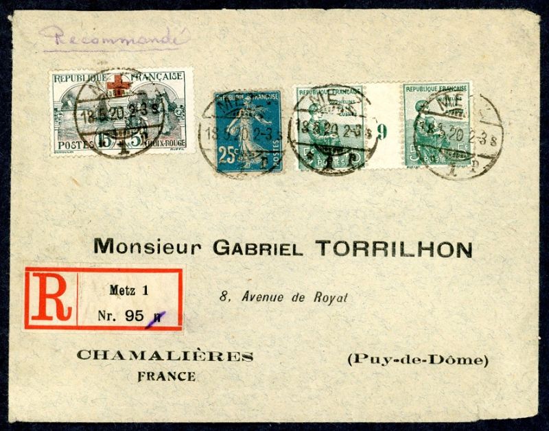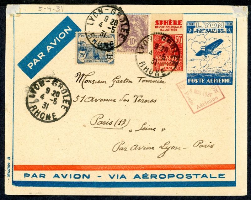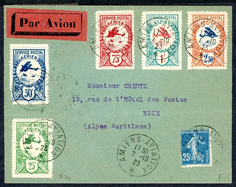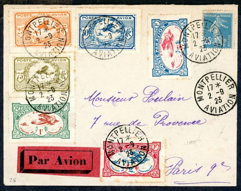 FRANCE 1923 Montpellier Aviation Meet (6) different labels tied on cover by multiple Montpellier Aviation 9/2/23 cds, some perf tip toning, franked w/ 25c Sower, appropriate back stamps, F-VF (Image)