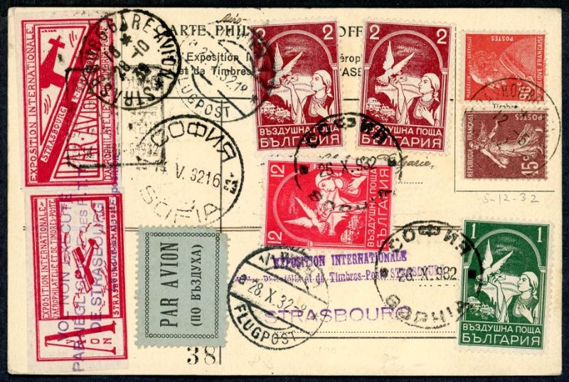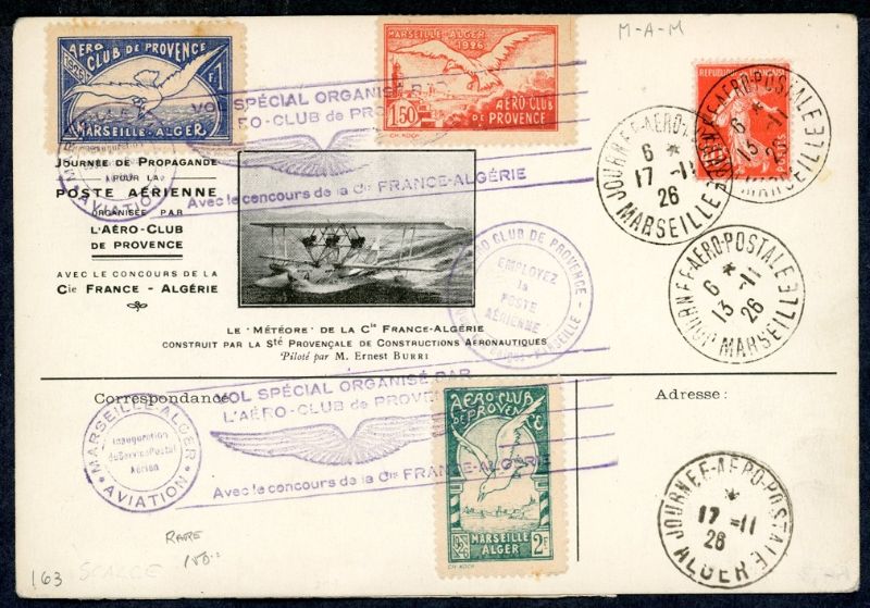 FRANCE 1926 Club de Provence Marseille-Algerie, (3) different flight labels tied on card by various flight cachets, small picture of Le Meteore flying boat, 40c Sower issue tied by “Journee Aeropostal Marseille” 11/13/26 cds, Alger 11/17/26 receiver, VF flight card, quite scarce if not rare (Image)