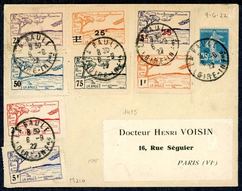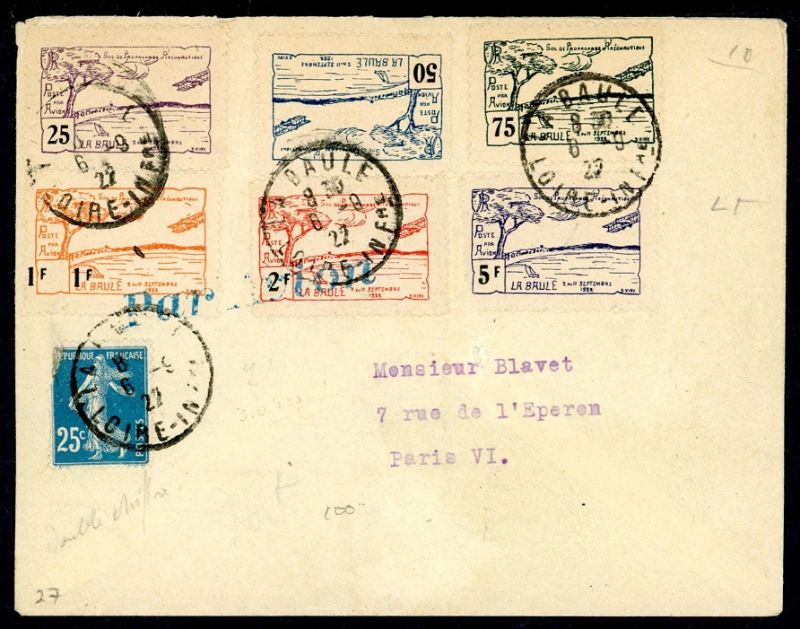 FRANCE 1927 La Baule Aviation Meet complete set of (6) labels plus (2) w/ surcharges (only 2,000 sets issued), all tied on cover by La Baule 9/6/27 cds, additionally franked w/ 25c Sower, 1980 Simart Cert (Image)