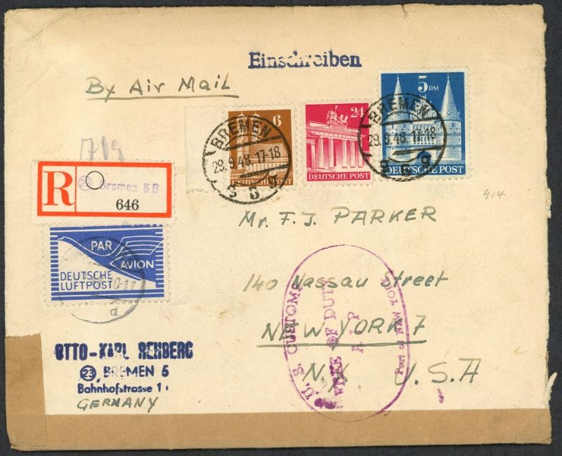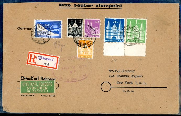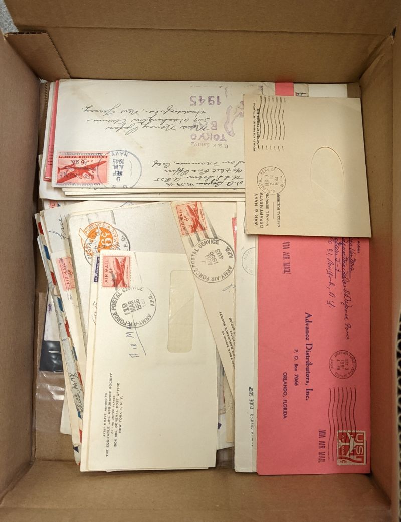 C25-C31 Large dealer stock of abt (500) airmail covers, all franked w/ Transport Plane issue, ea in annotated sleeve, filling a cover box, postmarked 1941-57; comml & personal, many censored, corner cards, military postmarks (APO numbers identified on sleeve), many auxiliary markings, Hawaii & Alaska pmks, special delivery, PPC, single use & combos, incl Prexies; expect some faults as wrinkles, flap marks, gen F-VF (Image)