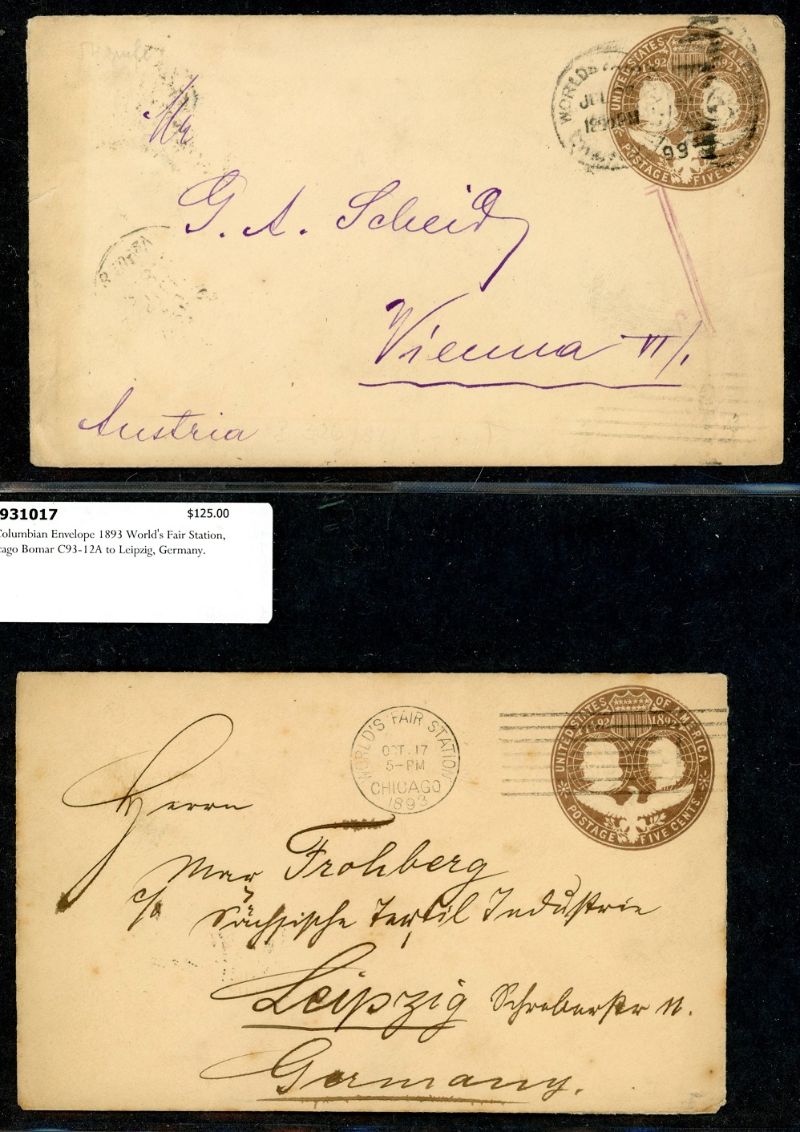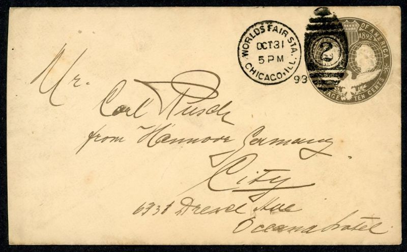 U351 Columbian 10¢ entire, mailed by German visitor to himself at his local hotel, canceled by bold World's Fair "2" duplex cancel 10/31/93 (Bomar C93-02); F-VF (Image)