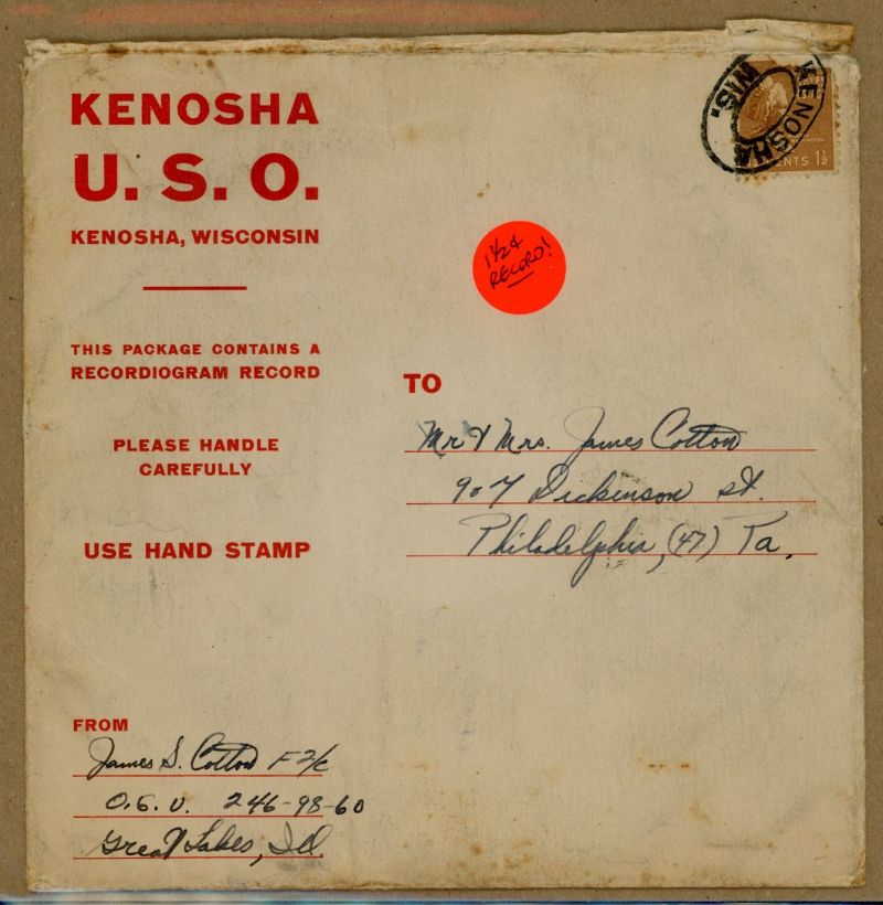 Square cover especially designed to send a Recordiogram record, sent from Kenosha, Wis. USO to Philadelphia (return address Great Lakes Naval Station, IL), the record is included but we didn't attempt to play it, dated July, 1945; unusual item, early version of "voice mail" F-VF (Image)