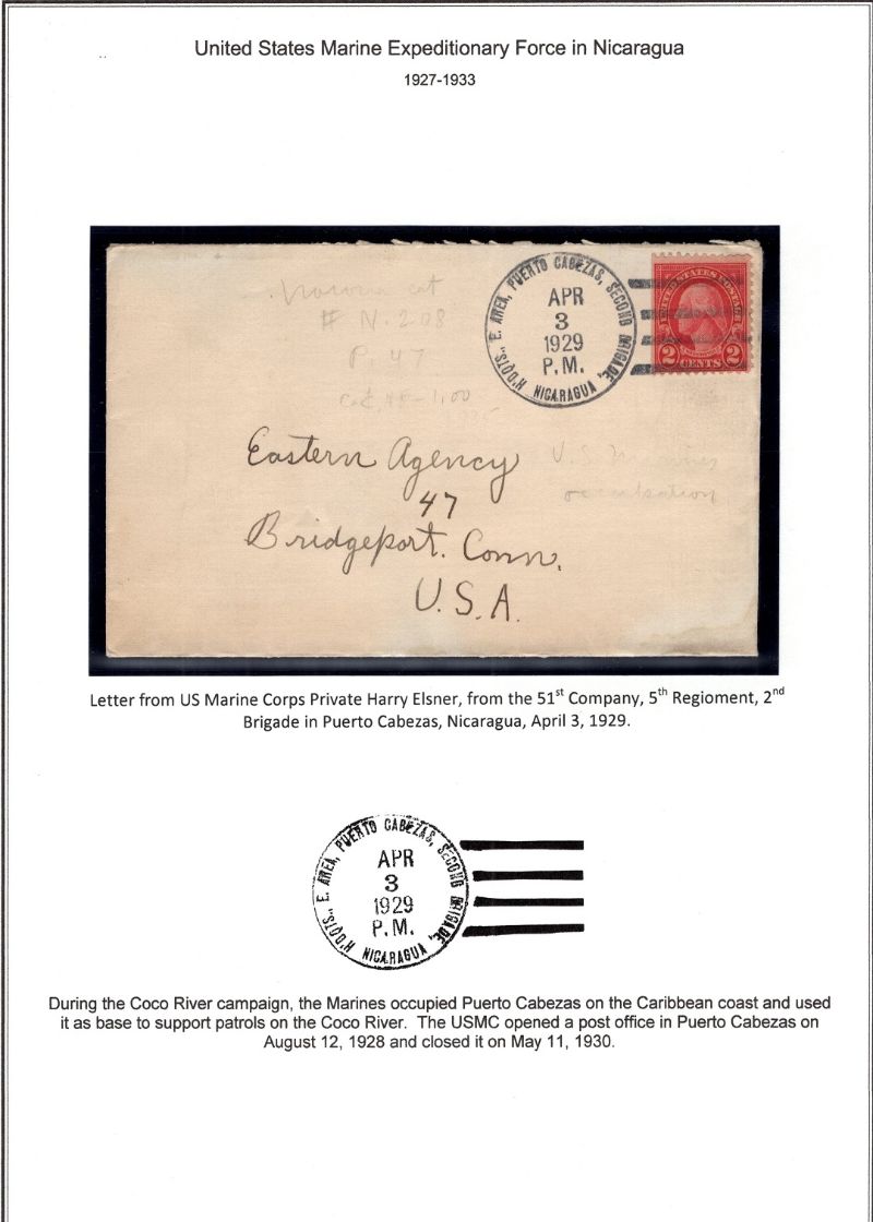 US Occupation of Nicaragua (23) 1927-31 on annotated pgs mostly w/ US stamps incl (2) w/ Puerto Cabezas cancels from Rio Coco campaign, also (1) stampless "no stamps available" ms & (1) w/ Nicaraguan stamps, plus (4) photos, mostly in good shape (Image)