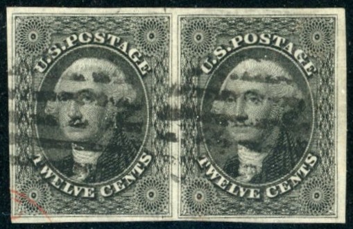 33, 36 1859 Folded letter to Charles Buckalew, the American minister to Ecuador, franked w/ 10¢ and V pair 12¢, tied by black grids, nearby Bloomsburg, Pa. pmk and red "24" handstamp; the 12¢ pair is vertically misperf, with the top stamp trimmed at left margin but strangely the bottom stamp left, showing how bad the perfs are; Buckalew was a lawyer politician, content is mostly about how business is going back home, mentioning railroad and coal companies; unfolded for display, file fold does not affect stamps, F (Image)