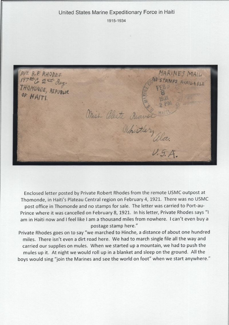 US Occupation of Haiti (37) on annotated pgs, starts w/ (3) 1915 warships & goes through 1933, incl USMC registered cancel, (2) "no stamps available" ms from remote outposts incl (1) w/ interesting content, as well as a Port-au-Prince & Cap Haitien, some missing or damaged stamps or stains, but abt half in good shape (Image)