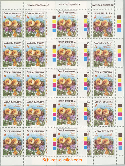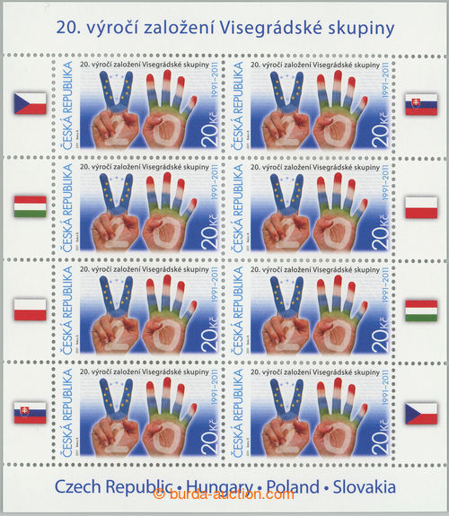 Philately. Pof.673, 20th Anniv of Visegrad Group 20CZK, complete counter sheet with production flaw on pos. 3 - significant blue stain on prostrednicku right hand; catalogue defect (Image) (Image2)