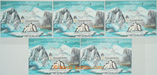Philately. Pof.A589 production flaw, Protection polarnich regions 35CZK, comp. 5 pcs of miniature sheets with production flaw, 1x production flaw 2 - rose circle below krou kreveta, 2x production flaw - rose circle in/at right