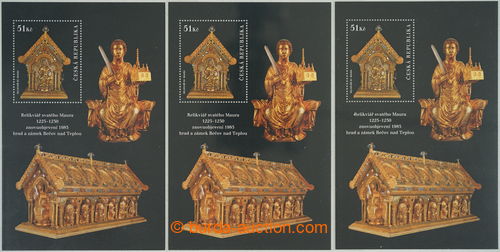 Philately. Pof.A593, Relikviar St. Maura 51CZK, comp. of 3 arsiku: 1x first edition with outlines round/about gravure on stmp., 2x surplus print with VV: production flaw small/rare circle R from chapel in/at hands St. Maura and