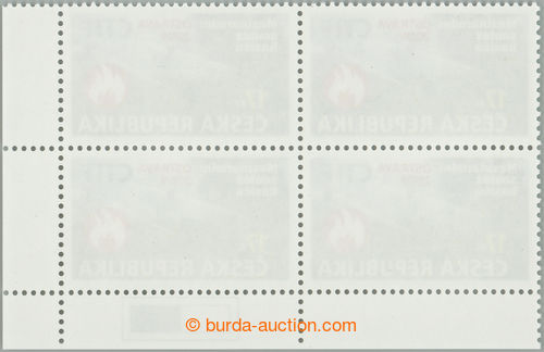Philately. Pof.602 production flaw, Firemen CTIF 17CZK, corner blk-of-4, production flaw 45/P - big green stain above R; catalogue misvalues, only on/for very small part/-s printing (Image) (Image2)