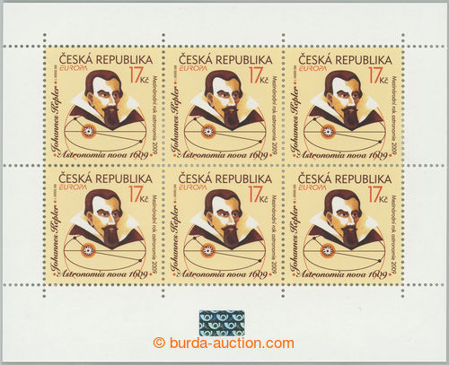 Philately. Pof.PL596, Kepler 17CZK, complete counter sheet with production flaw - double impression inscriptions on all pane positions, shifted hologram up outside embossed place, quite exceptional defect, mostly this is joined