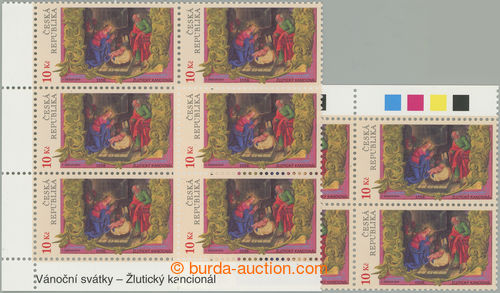 Philately. Pof.664 production flaw, Christmas 10CZK, two catalogue vady: production flaw 7/1B - golden circle in/at corner coat Joseph (corner blk-of-4) and production flaw 36/4B - sun through/over L part lower decoration at lower