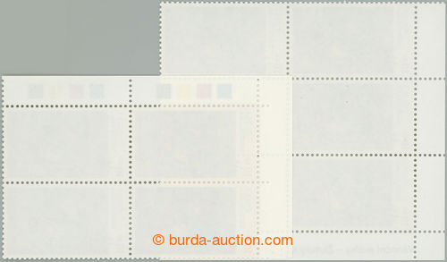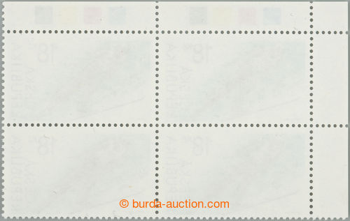 Philately. Pof.588 production flaw, World Championship in skiing 18CZK, UL corner blk-of-4, skidding print black color (significantly dark figure lyzare, double inscriptions); mint never hinged, c.v.. 1.600CZK (Image) (Image2)