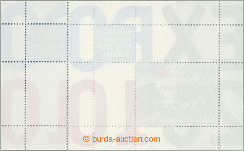 Philately. Pof.A623 production flaw, EXPO 2010 35CZK, comp. 12 pcs of miniature sheets with various significant stains, rings and other production flaw, i.a. 2x production flaw 1 - rose stain in X L from center (various stage),