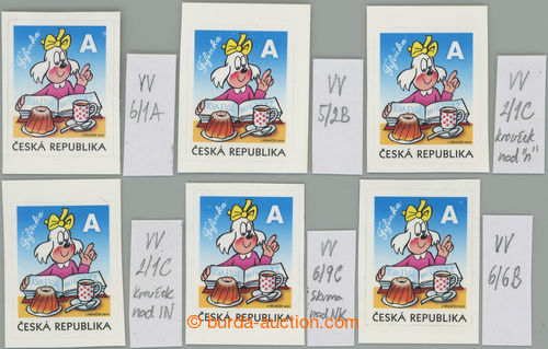 Philately. Pof.630 production flaw, Fifinka value A, comp. of 6 stamp. cut from booklets with c.v.. VV: 6/1A, 5/2B, 6/6B, 2/1C - circle above N (Fifinka), 2/1C - circle closely above IN (Fifinka) and very interesting, still