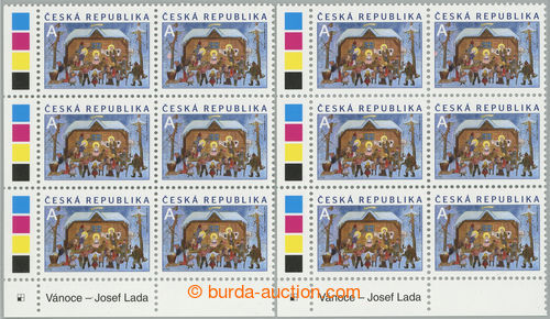 Philately. Pof.828 production flaw, Christmas - Lada value A, 2x L the bottom corner blk-of-6 with production flaw 37/3 - big rose stain L from tree, 2 c.v.. location (month and pulmesic); interesting selection of (Image) (Image2)