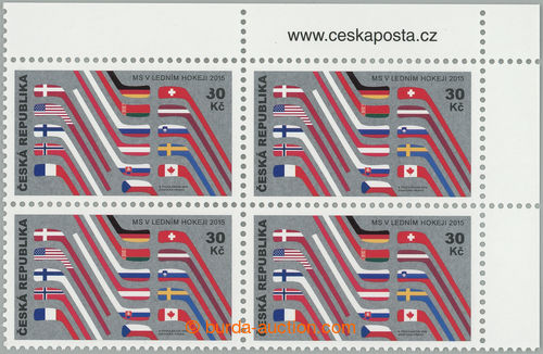 Philately. Pof.845 production flaw, World Championship in ice hockey 30CZK, corner blk-of-4 with c.v.. flaw production flaw 4/4 - significant incomplete-printing numeral(s) 3 in value; sought (Image) (Image2)
