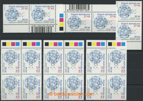 Philately. Pof.880 production flaw, Jaderny institution 27 CZK, 3x marginal blocks of four s tremi stages production flaw 12/3 (in/at upper blue atomu, between blue and sedym atomem and v prave part/-s sedeho atomu) and three