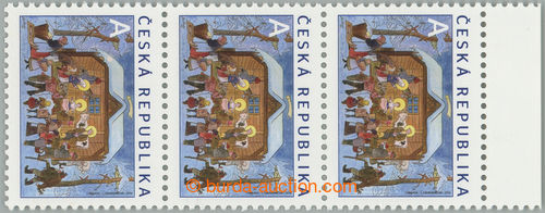 Philately. Pof.828 production flaw, Christmas - Lada value A, vertical strip of 3 with upper margin and with production flaw 13/3 - shifted light stain on roof; mint never hinged (Image) (Image2)