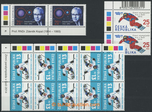 Philately. Pof.797, 798, 803, selection of three sought catalogue ofsetovych flaws, Pof.797, Soci with production flaw 6/1 yellow circle on/for kombineze (corner Pr) + Pof.798, Paralympic Games 13CZK with production flaw 32/2 white