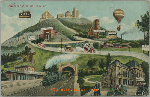 2477 imagePicture Postcards. SNeZKA - in/at future (Schneekope in der Zukunft), collage, train in/at tunnel with railway-station, balon, cars, coloured collotype, issued Hermann Poy, Dresden, Us; bumped corners, good condition (Image) (Image2) (All Images)