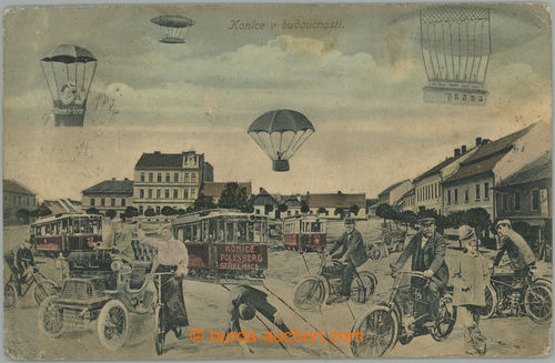 2470 imagePicture Postcards. KONICE - in/at future, collage, Zeppelin, tram, car, people in the square, coloured seriography, issued F. Klic - Konice, Us; additionally mounted stamp. and bumped corners (Image) (Image2) (All Images)