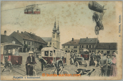 2472 imagePicture Postcards. KOJETIN - in/at future, collage, Zeppelin, tram, car, people in the square, coloured seriography, issued A. Vlacilik - Kojetin, Us; stains in paper (Image) (Image2) (All Images)