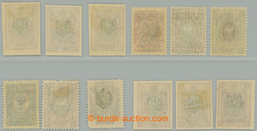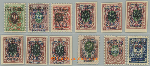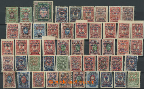 Philately. SELECTION / WRANGEL- ARMY - Constantinopol, overprint I. type normal + II. type RUSSKAJA POCTA on Russian stamp 2k-70k and 7Rbl, face-values 1000Rbl-20000Rbl; some spots, mostly fine, incl. overprints on stamps for