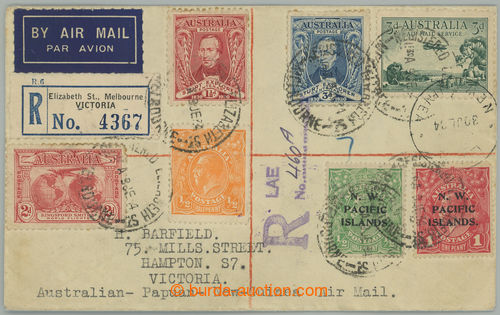 Philately. Reg and airmail letter to Victoria and back to Melbourne, sent by first flight New Guinea - Australia and back, richly with Rajka, N.W. PACIFIC ISLANDS, air-mail and postage stmp Australia, various CDS and arrival