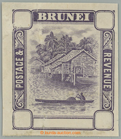 Philately. PLATE PROOF SG.43, Brunei River 25c violet imperforated, in definitive color, WITHOUT FACE VALUE; minor faults (Image) (Image2)