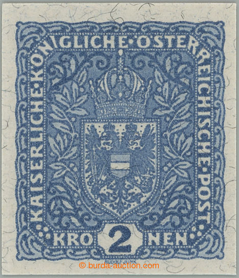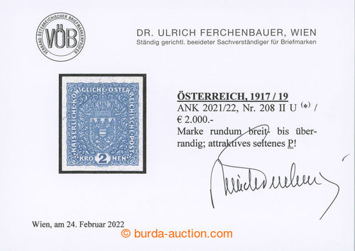 910 ng imagePhilately. POSTAGE STAMPS / VELKY FORMAT/ Pof.P208IIN, Coat of arms 2 Koruna on granite paper, imperforated; very fine, issued without gum, certificate Ferchenbauer, c.v.. 30.000 CZK, rare stamp (ex Wiener Postarchiv 2015) (Image) (Image2) (Image3) (All Images)
