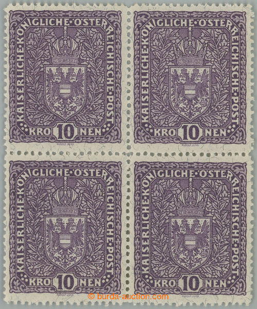 912 nh imagePhilately. POSTAGE STAMPS / VELKY FORMAT / ANK.211I, Coat of arms 10K light violet, block of four, granite paper, high size; mint never hinged, c.v.. ca. 6.000CZK, 10K in/at uzkem format is rare and in catalogues undervalued! (Image) (Image2) (All Images)
