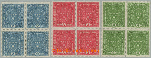 909 nh imagePhilately. POSTAGE STAMPS / VELKY FORMAT / ANK.208-210, Coat of arms 2K-4K, granite paper, in blocks of four; superb, c.v.. ca. 1.525Kc (Image) (Image2) (All Images)
