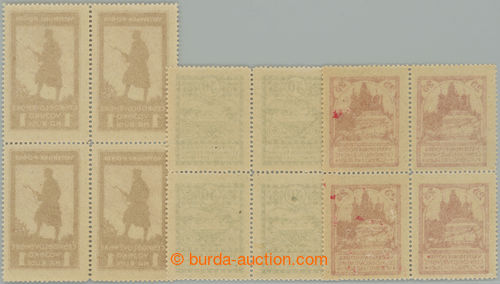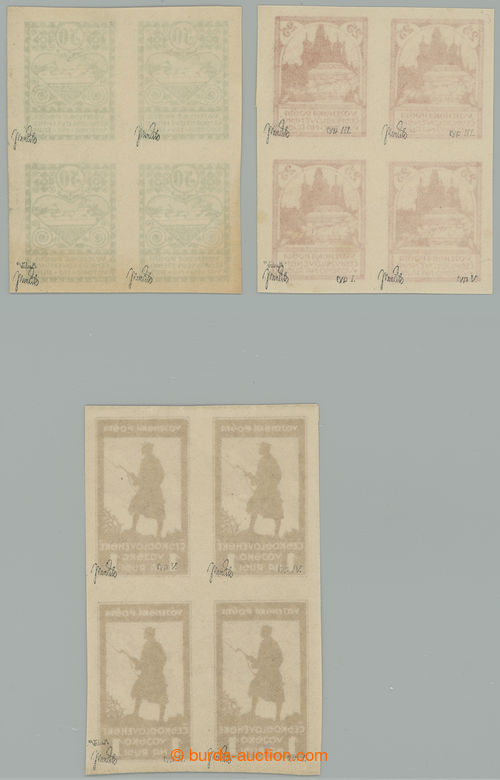 Philately. Pof.PP2-PP4, Charitable stamps - silhouette, imperforated set in/at blocks of four, 2x marked types; without gum, 1x slightly toned in margins, exp. by Mrnak and Vrba (Image) (Image2)
