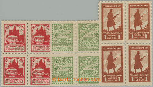 Philately. Pof.PP2B-PP4B, Charitable stamps - silhouette, set with line perforation 13¾ in blocks of four; mint never hinged, 25k minor gum fault
