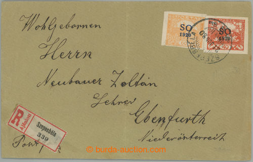 Philately. MIMOPLEBISCITNI TERRITORY / Reg letter sent in/at III. postal rate to Austria, with Hradcany 40h and 60h with overprint, Pof.SO11 and 14, posting Hungarian CDS SZEPESBELA 21.JUN.20 (Spisska Bela), right franked/paid;