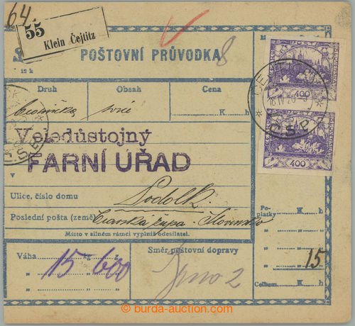 Philately. ORAVA - POSTAGE-DUE / more/larger part parcel C.O.D. dispatch-note sent from Cejtic on/for plebiscitary Oravu, at the delivery place paid fee overprint stamp. Postage due stmp 15h, Pof.SO35, cancelled by postmark PODVLK