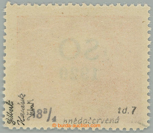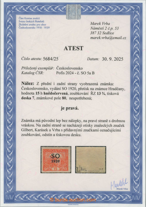 Philately. Pof.SO5aB, Hradcany 15h brown-red, VII. TISKOVA DESKA, pos. 80, line perforation 13¾; mint never hinged, light warping paper, Vrba certificate, exp. by Gilbert., Karasek, very rare piece from sedme printing plate, quite