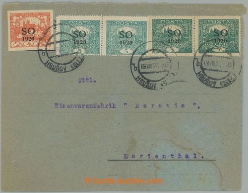 Philately. commercial letter right paid for IV. postal rate stamp. Pof.SO11 and Pr Pof.SO3A and SO3Ca, nationalized CDS HRUSOV (SLEZ.) 19.VIII.20; stain, overall well preserved (Image) (Image2)