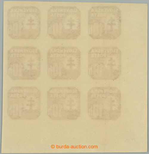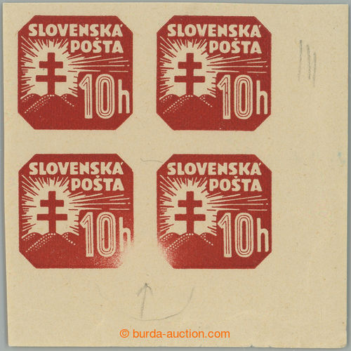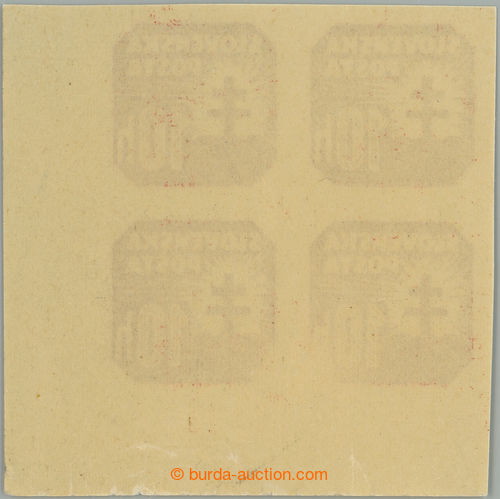 1502 nh imagePhilately. Sy.NV14Xy production flaw, Coat of arms (I) 10h red-brown, without watermark, vertical grid, LR corner blk-of-4 with interesting incomplete printing between pane position 99 and 100; mint never hinged, pokrceni paper in margin (Image) (Image2) (All Images)