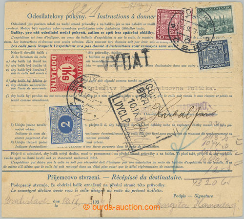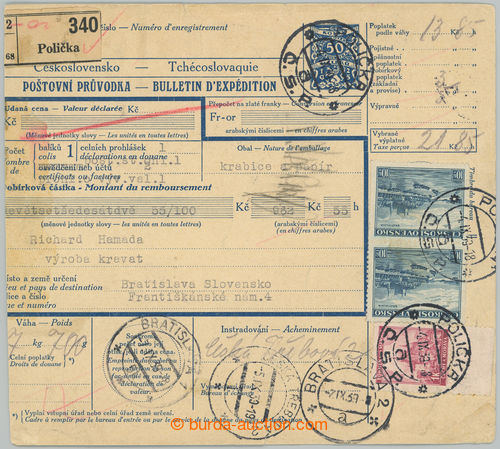1510 imagePhilately. larger part C.O.D. international dispatch-note sent from Protectorate to Slovakia, delivering fee paid mixed franking parallel Czechosl. Postage due stamp 2CZK and Slovak 1Ks with CDS BRATISLAVA 13.IX.39, with mixed franking of czechosl. and Bohemian and Moravian stamp. with CDS POLICKA 4.IX.39; good condition (Image) (Image2) (All Images)