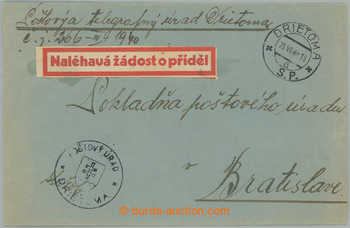 1515 imagePhilately. Nalehava request for pridel - red label on/for off. mailing post with CDS DRIETOMA 25.VII.40, supplemented with service cancel. same post with emblem, sent to post to Bratislava; good condition (Image) (Image2) (All Images)