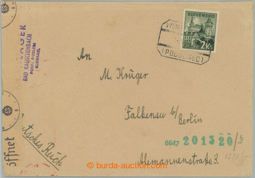 1518 imagePhilately. KINDERLANDVERSCHICKUNG BAD RAUSCHENBACH / letter sent from child camp KLV Vysne Ruzbachy to Germany, with 2 Koruna Bojnice, posting framed CDS VYSNE RUZBACHY 4.V.?, blue straight line postmark K.L.V.-LAGER/ BAD RAUSCHENBACH/ POST: PODLEIN/ SLOWAKEI, passed through censorship; fold, interesting (Image) (Image2) (All Images)