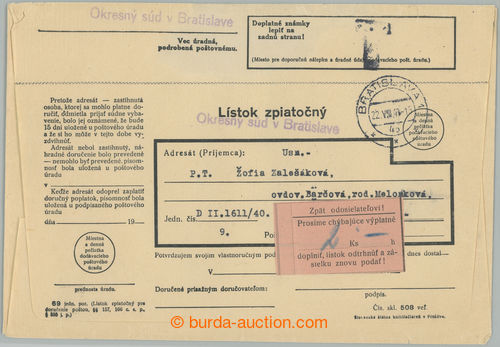 1512 imagePhilately. rose label Back odesilteli!/ Prosime chybajuce vyplatne 2Ks doplnit, listok odtrhnut a zaselku znovu podat!,, mounted on court obsilce with CDS BRATISLAVA 1/ 22.VIII.41; wrinkled margins, rare! (Image) (Image2) (All Images)
